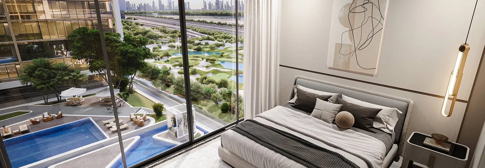 - 推窗即揽三重盛景:哈利法塔城市地标风光、高尔夫球场茵茵绿意与水滨秘境的悠然景致