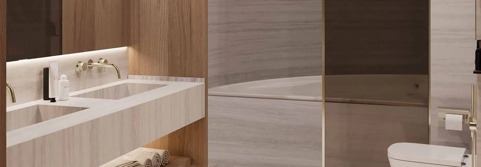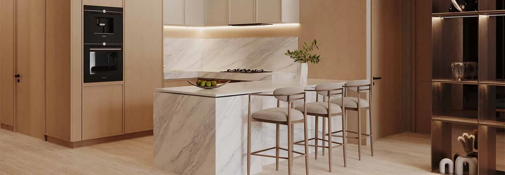 • 精工选材:凝灰岩地板、Calacatta粉红大理石台面、古铜五金等高端材质完美融合